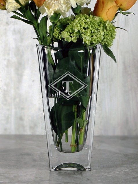 The monogram style should use the last name initial in the center (the largest letter). For barware and related items, the husband's first name initial is generally first (on the left side). For all other pieces, the wife's first name initial usually appears first (on the left side).